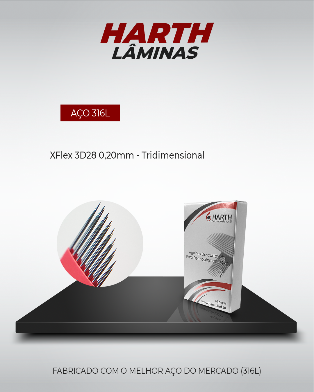 Toda a linha de lâminas e agulhas Harth é produzida com aço 316L, o mesmo material utilizado em indústrias de alta exigência, como a naval e a médica.