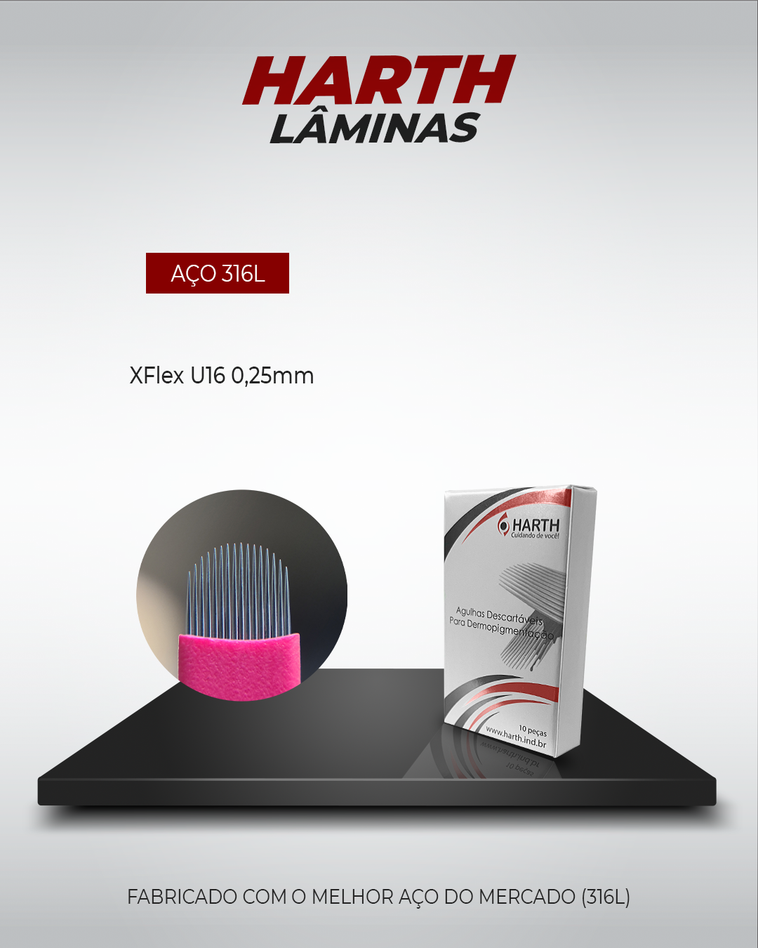 Toda a linha de lâminas e agulhas Harth é produzida com aço 316L, o mesmo material utilizado em indústrias de alta exigência, como a naval e a médica.